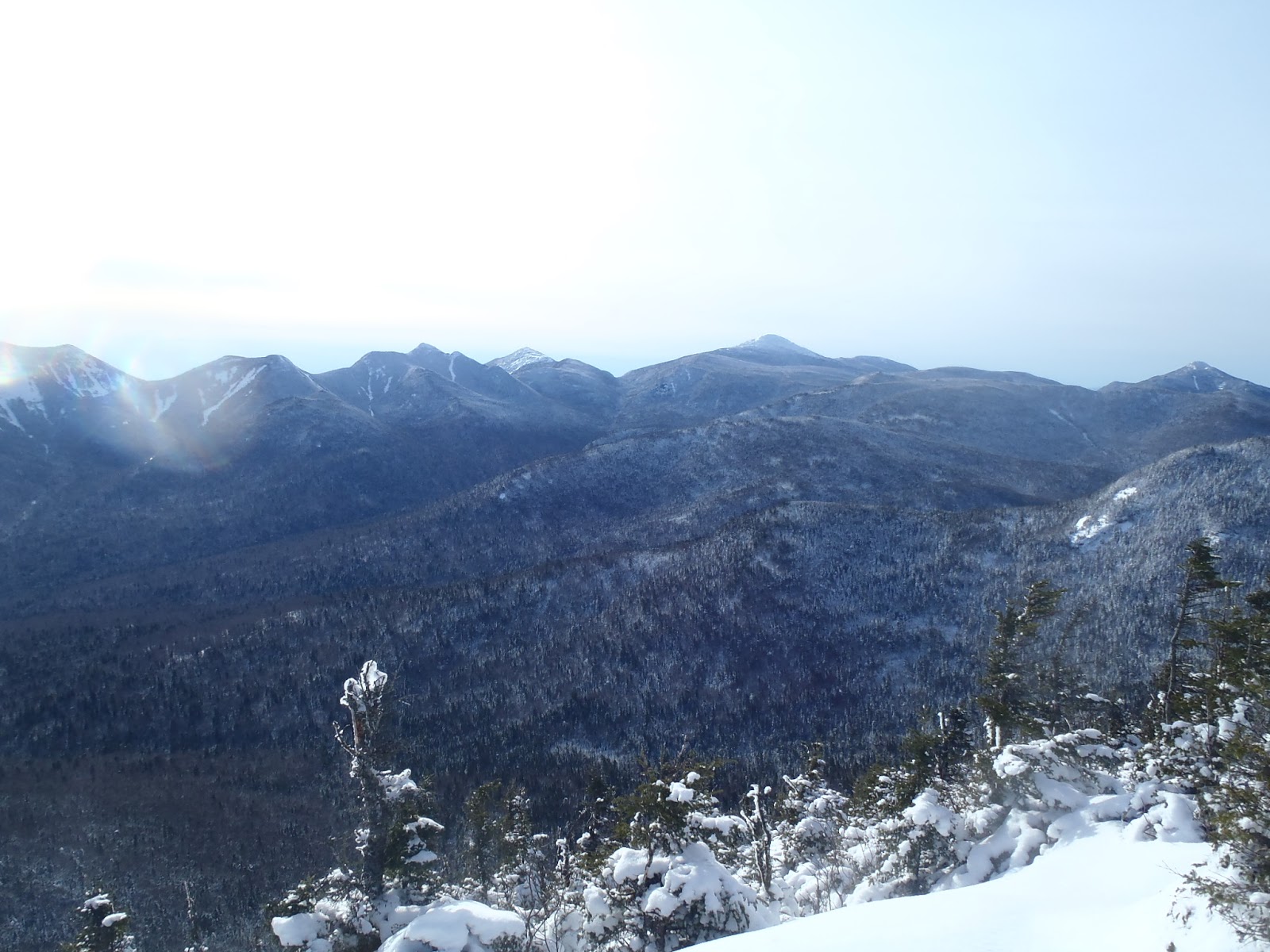 On paper and in the rest of the hiking season, the mileage and elevation gain for this next section is pretty standard high peaks hiking. As a novice winter hiker I was in over my head. Any gain in elevation meant increased snow depth. The Warm temps and bright blue skies meant wet and heavy snow. I was frustrated with myself, knowing I should have picked a hike where the trail was likely going to be packed out at least a little. It was dangerous for both myself and my young dog to be back on a seldom traveled trail in the middle of the week mucking through heavy deep snow. After some very successful 'road-less-traveled' hikes in the recent past (Blueberry mtn>Porter>Cascade, Hopkins>Giant) I didn't think seriously enough about the recent snow.